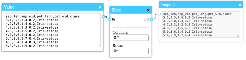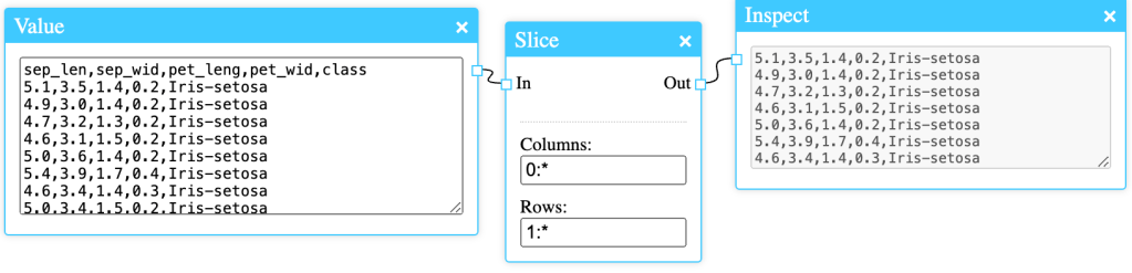 In this example the full Iris dataset is entered in the Value node. The asterisk (*) symbol is replaced by the column or row count, depending on which field it’s entered in. The Slice node above will not change the data at all in the configuration above.