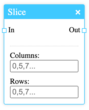 The Slice node takes a dataset as input, removes parts of it as specified by two text fields, and then outputs a new dataset.