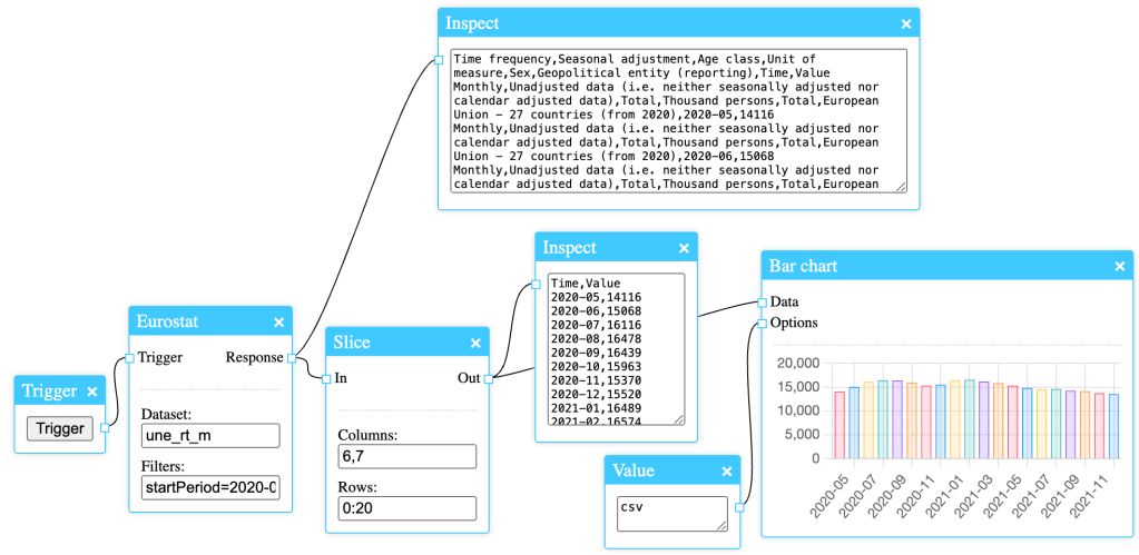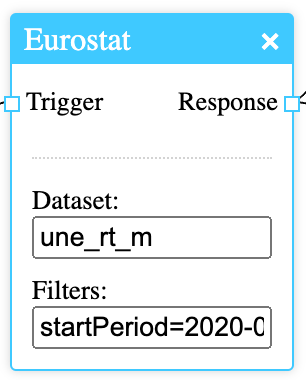 The input is a trigger which initiates the request to the server. A simple trigger is the Trigger node which only contains a button and allows the user to initiate the request. When a response is returned, the raw data is outputed. In this specific example, the une_rt_m dataset is requested with the filters startPeriod=2020-05&endPeriod=2024-06.